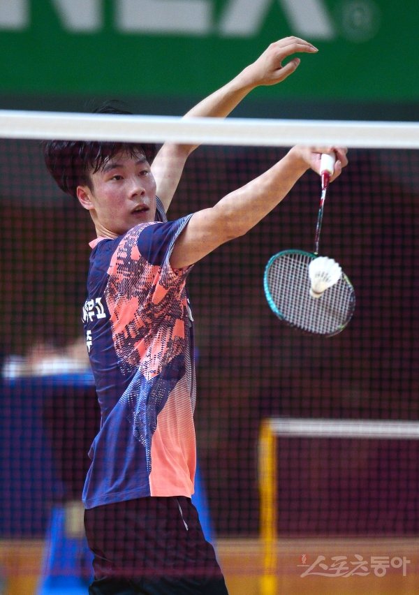 14일 전라남도 화순 하니움문화스포츠센타와 이용대체육관에서 열린 제10회 ‘이용대 올림픽제패기념 2019 화순 전국학교대항 및 실업대항 배드민턴선수권대회’ 남자고등학교 단체전 준결승 3단식에서 전대사대부고 박상용이 리턴을 하고 있다.