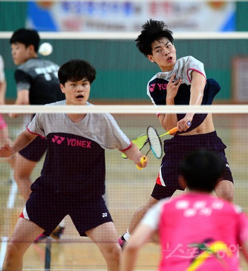 14일 전라남도 화순 하니움문화스포츠센타와 이용대체육관에서 열린 제10회 ‘이용대 올림픽제패기념 2019 화순 전국학교대항 및 실업대항 배드민턴선수권대회’ 남자고등학교 단체전 준결승 2복식에서 당진정보고 이석찬-오민규(오른쪽) 조가 스매싱 공격을 하고 있다. 화순|김종원 기자 won@donga.com