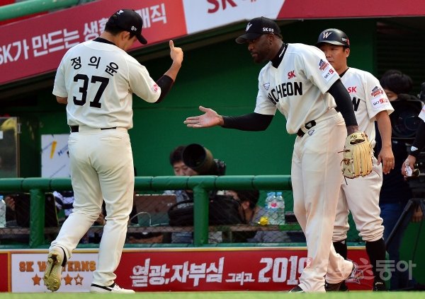 14일 인천 SK행복드림구장에서 ‘2019 신한은행 MY CAR KBO리그’ SK 와이번스와 키움 히어로즈의 경기가 열렸다. 7회까지 키움 공격을 1실점으로 막은 SK 선발 소사가 이닝 종료 후 정의윤과 하이파이브를 나누고 있다.