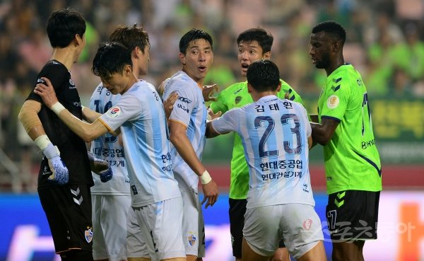 14일 전주월드컵경기장에서 ‘하나원큐 K리그1 2019’ 전북 현대와 울산 현대의 경기가 열렸다. 후반 울산 골키퍼 오승훈과 전북 홍정호(오른쪽 세 번째)가 신경전을 벌이고 있다.