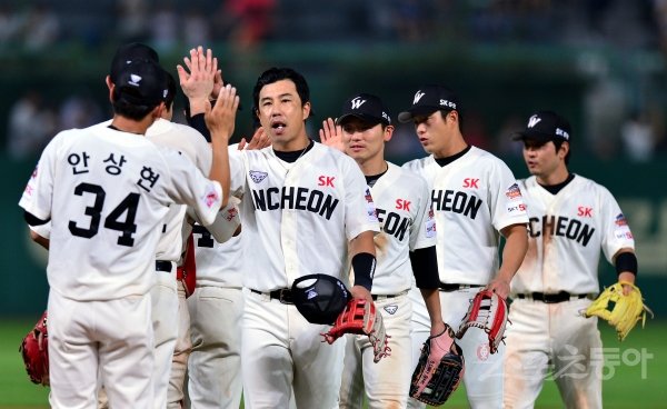 14일 인천 SK행복드림구장에서 ‘2019 신한은행 MY CAR KBO리그’ SK 와이번스와 키움 히어로즈의 경기가 열렸다. SK가 키움에 4-3으로 승리한 뒤 선수들이 그라운드에서 기쁨을 나누고 있다.