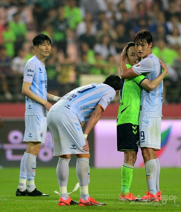 14일 전주월드컵경기장에서 열린 ‘하나원큐 K리그1 2019’ 전북 현대와 울산 현대의 경기에서 양 팀이 1-1로 승부를 가리지 못했다. 경기 후 신경전을 벌였던 전북 문선민과 울산 박용우(오른쪽)이 포옹을 하고 있다.
