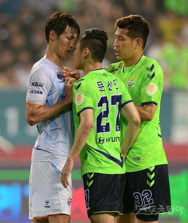 14일 전주월드컵경기장에서 ‘하나원큐 K리그1 2019’ 전북 현대와 울산 현대의 경기가 열렸다. 후반 울산 박용우와 전북 문선민(오른쪽)이 신경전을 벌이고 있다.