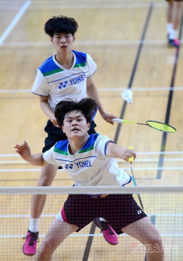15일 전라남도 화순 하니움문화스포츠센타와 이용대체육관에서 열린 제10회 ‘이용대 올림픽제패기념 2019 화순 전국학교대항 및 실업대항 배드민턴선수권대회’ 남자고등학교 단체전 결승 1복식에서 당진정보고 이석찬(앞)-오민규 조가 스매싱 공격을 하고 있다.