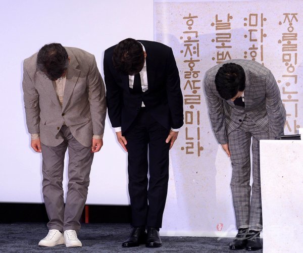 조철현 감독과 배우 송강호, 박해일(왼쪽부터)이 15일 서울 강남구 삼성동 메가박스 코엑스에서 열린 영화 ‘나랏말싸미’ 언론시사회에 참석해 고개 숙여 인사를 하고 있다.