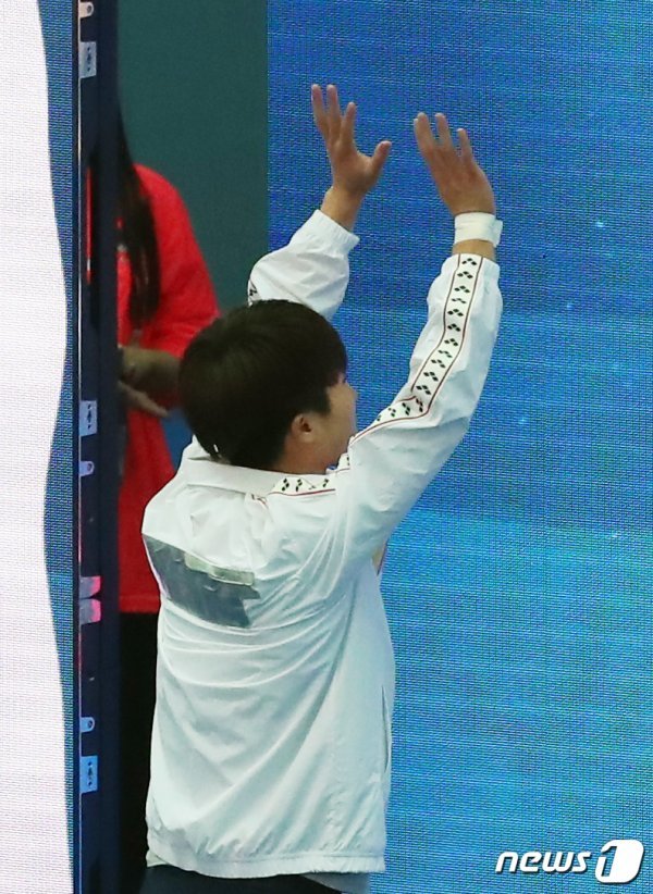 다이빙 선수 우하람(21·국민체육진흥공단)은 지난 14일 광주 남부대 시립국제수영장에서 열린 다이빙 남자 1m 스프링보드 결선에 출전했다. 이날 각국의 선수들은 자신들의 국가 이름이 새겨진 트레이닝복을 입고 있었는데, 우하람 선수의 트레이닝복 뒤에는 은색 테이프가 붙어있던 것.
