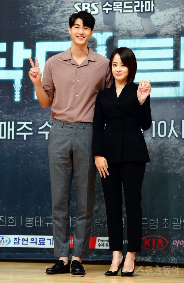 16일 서울 목동 SBS방송센터에서 열린 SBS 수목드라마 ‘닥터탐정’ 제작발표회에 참석한 이기우와 류현경이 카메라를 향해 포즈를 취하고 있다.