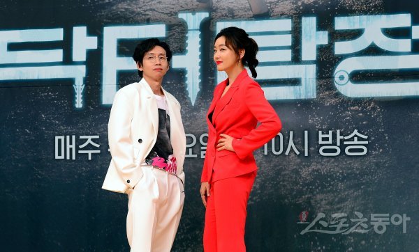 16일 서울 목동 SBS방송센터에서 열린 SBS 수목드라마 ‘닥터탐정’ 제작발표회에 참석한 봉태규와 박진희가 카메라를 향해 포즈를 취하고 있다.