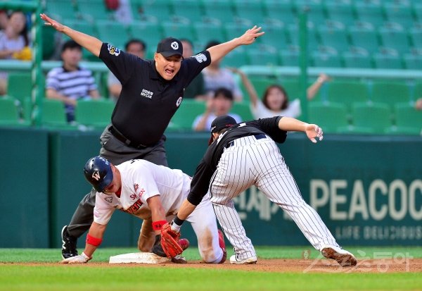 16일 인천 SK행복드림구장에서 ‘2019 신한은행 MY CAR KBO리그’ SK 와이번스와 LG 트윈스의 경기가 열렸다. 3회말 1사 2루에서 SK 최정 타석 때 2루 주자 노수광이 3루 도루에 성공하고 있다.