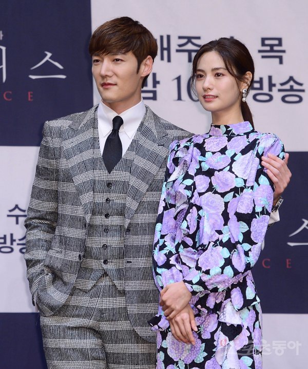 배우 최진혁과 나나(오른쪽)가 17일 서울 구로구 라마다 서울 신도림에서 열린 KBS 2TV 새 수목드라마 ‘저스티스’ 제작발표회에서 포즈를 취하고 있다.