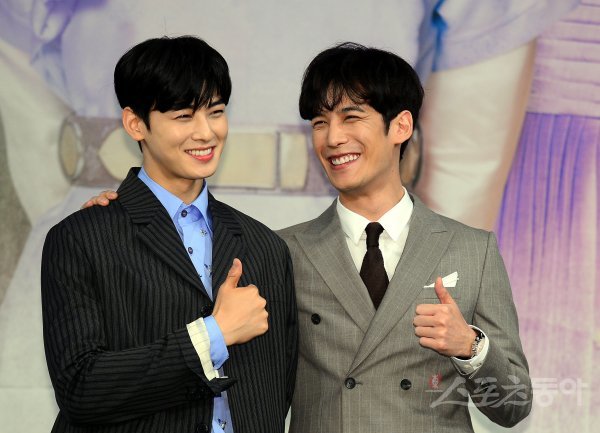 17일 서울 상암동 MBC사옥에서 열린 MBC 수목미니시리즈 ‘신입사관 구해령’ 제작발표회에 참석한 차은우와 박기웅이 카메라를 향해 포즈를 취하고 있다.