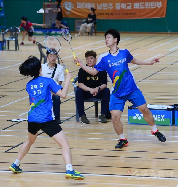 17일 전라남도 화순 하니움문화스포츠센타와 이용대체육관에서 열린 제10회 ‘이용대 올림픽제패기념 2019 화순 전국학교대항 및 실업대항 배드민턴선수권대회’ 고등부 혼합복식 8강에서 매원고 오성원-영덕고 이나원 조가 아웃되는 셔틀콕을 바라보고 있다.