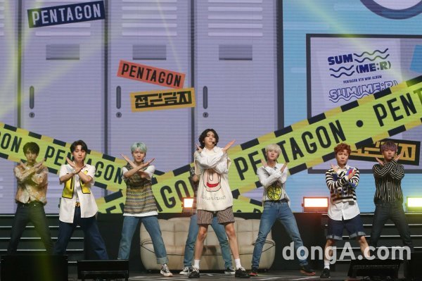 그룹 펜타곤이 17일 오후 서울 용산구 블루스퀘어 아이마켓홀에서 열린 미니앨범 \'썸머(SUM(ME:R))\' 발매 기념 쇼케이스에서 새로운 무대를 선보이고 있다.동아닷컴 국경원 기자 onecut@donga.com