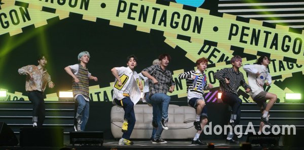 그룹 펜타곤이 17일 오후 서울 용산구 블루스퀘어 아이마켓홀에서 열린 미니앨범 \'썸머(SUM(ME:R))\' 발매 기념 쇼케이스에서 새로운 무대를 선보이고 있다.동아닷컴 국경원 기자 onecut@donga.com