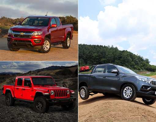 쌍용차가 독주하던 국내 픽업 트럭 시장에 전통의 강자 쉐보레와 지프가 뛰어들며 본격적인 시장 경쟁을 예고하고 있다. 쉐보레 콜로라도, 렉스턴 스포츠 칸, 지프 글래디에이터(왼쪽 상단부터 시계 방향으로). 사진제공|쉐보레·쌍용차·지프