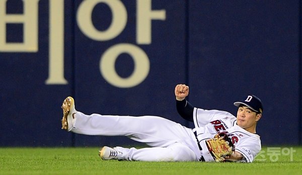 두산 김재환이 4회초 무사 1루에서 상대 타자의 타구를 몸을 날려 잡아내고 있다.