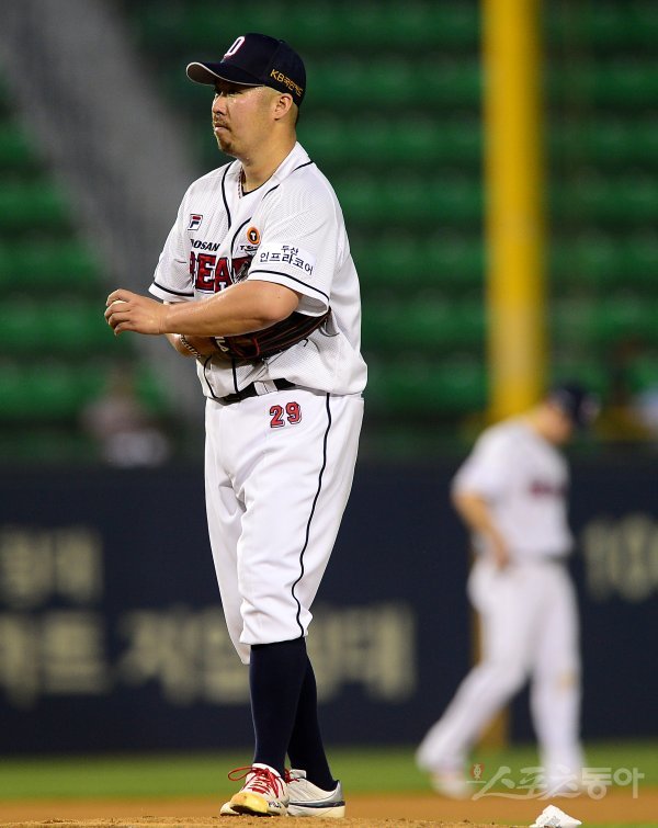 두산 선발 유희관이 5회초 무사 1,3루에서 적시타를 허용한 후 아쉬워하고 있다.