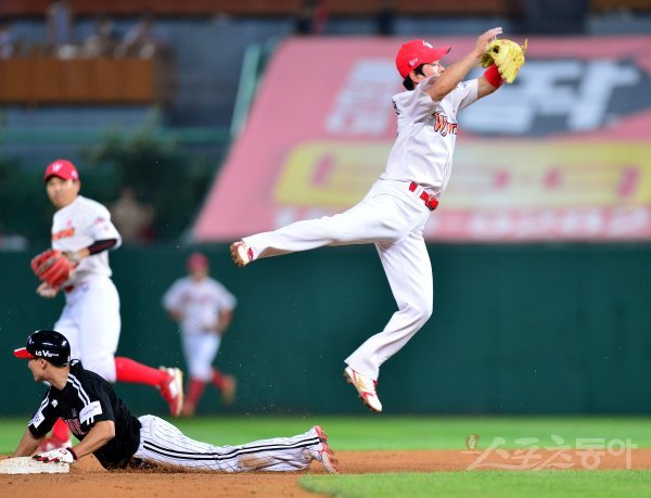 5회초 1사 1루에서 LG 김현수 타석 때 1루 주자 신민재가 2루 도루에 성공하고 있다.