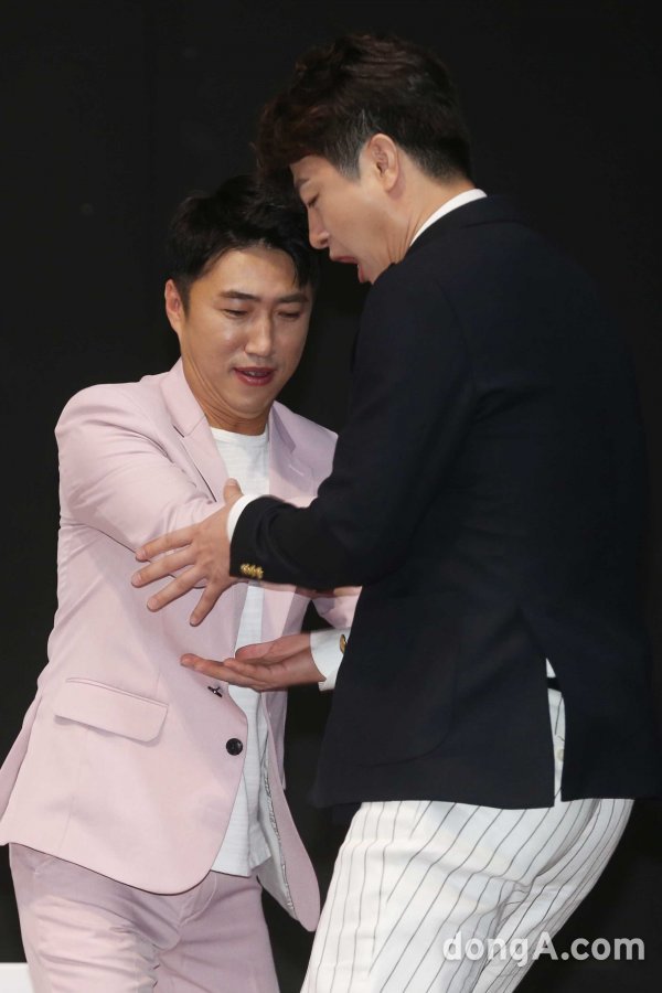 개그맨 장동민(왼쪽)과 유상무가 18일 오후 서울 강서구 KBS아레나에서 열린 예능 프로그램 \'왕자e게임\'제작발표회에 참석하고 있다.