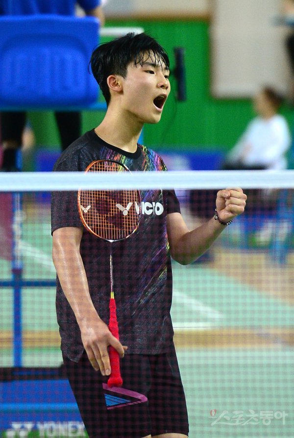 18일 전라남도 화순 하니움문화스포츠센타와 이용대체육관에서 열린 제10회 ‘이용대 올림픽제패기념 2019 화순 전국학교대항 및 실업대항 배드민턴선수권대회’ 남자고등부 단식 준결승에서 서울체고 유태빈이 승리를 확정지은 후 환호하고 있다.