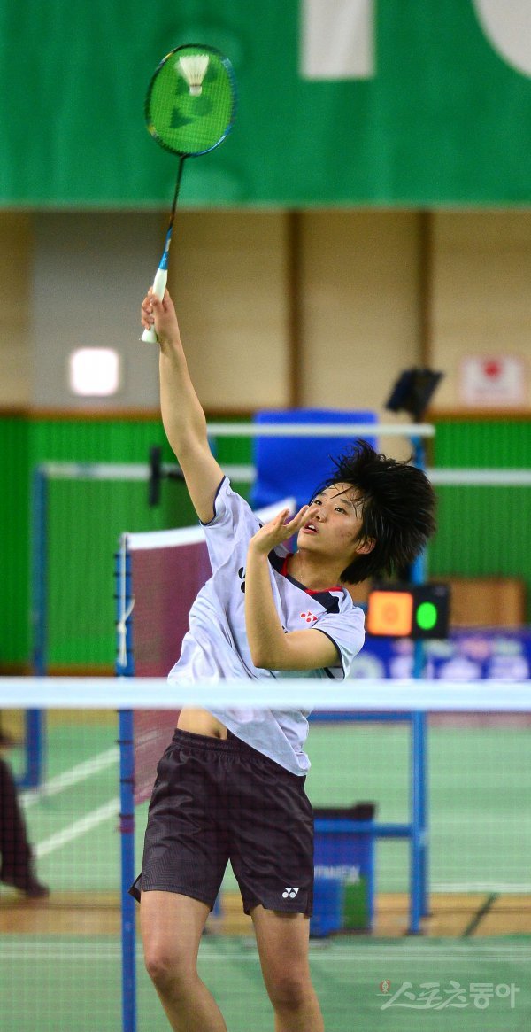 18일 전라남도 화순 하니움문화스포츠센타와 이용대체육관에서 열린 제10회 ‘이용대 올림픽제패기념 2019 화순 전국학교대항 및 실업대항 배드민턴선수권대회’ 여자고등부 단식 준결승에서 광주체고 안세영이 스매싱 공격을 하고 있다.