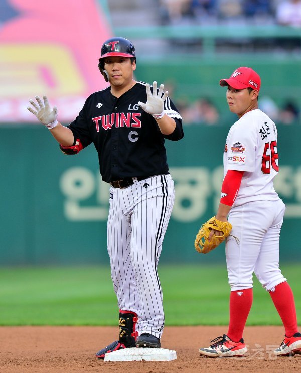 2회초 1사 1, 3루에서 LG 김현수가 2타점 2루타를 날린 뒤 환호하고 있다.