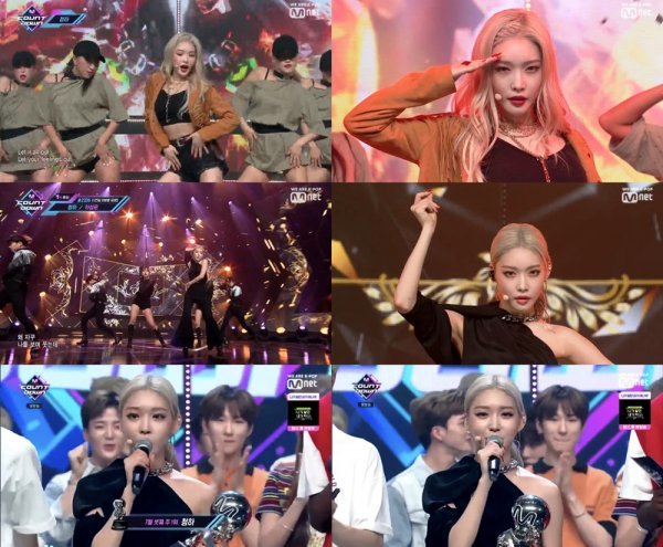 지난 18일 방송된 Mnet \'엠카운트다운\'(이하 \'엠카\')에서 청하의 네 번째 미니앨범 \'플러리싱(Flourishing)\' 타이틀곡 \'스내핑(Snapping)\'이 7월 셋째 주 1위를 차지했다.