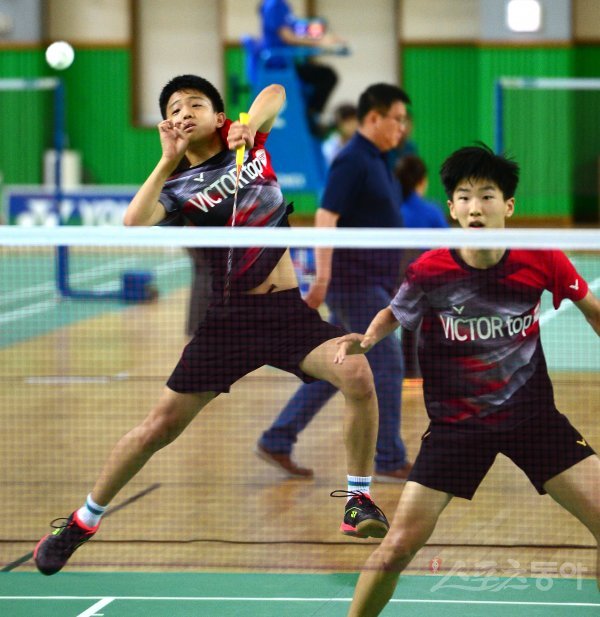19일 전라남도 화순 하니움문화스포츠센타와 이용대체육관에서 열린 제10회 ‘이용대 올림픽제패기념 2019 화순 전국학교대항 및 실업대항 배드민턴선수권대회’ 남자고등부 복식 결승에서 완주중 박승민(왼쪽)-김태림 조가 스매싱 공격을 하고 있다.