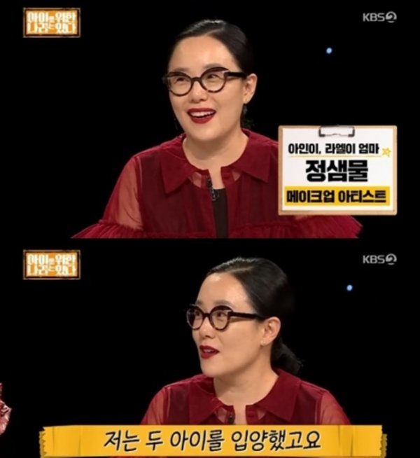 두 아이의 엄마 정샘물은 아이들을 입양했다는 사실을 밝혔다. 정샘물은 "아인이는 7살, 라엘이는 3살"이라면서 "신애라 언니가 굉장히 많은 멘토링과 코칭을 해줬다. 아이가 느끼는 (입양에 대한)궁금증을 하나도 숨기지 않았다고 하더라"라고 말했다.