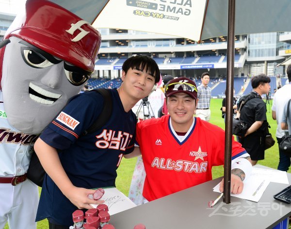 21일 창원NC파크에서 ‘2019 신한은행 MY CAR KBO리그’ 올스타전이 열렸다. 키움 박병호가 경기 전 열린 사인회에서 성남고 후배와 함께 포즈를 취하고 있다.