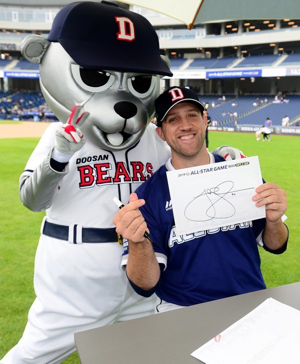 21일 창원NC파크에서 ‘2019 신한은행 MY CAR KBO리그’ 올스타전이 열렸다. 두산 린드블럼이 경기 전 열린 사인회에서 마스코트와 함께 포즈를 취하고 있다.