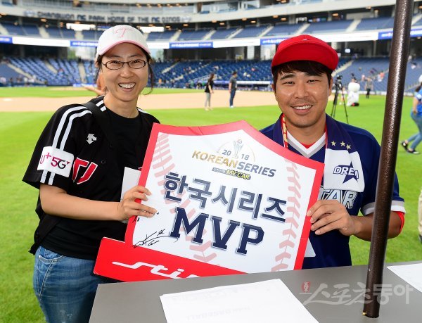 21일 창원NC파크에서 ‘2019 신한은행 MY CAR KBO리그’ 올스타전이 열렸다. SK 한동민이 경기 전 열린 사인회에서 지난 시즌 한국시리즈 MVP 간판대를 소장한 팬과 함께 포즈를 취하고 있다.