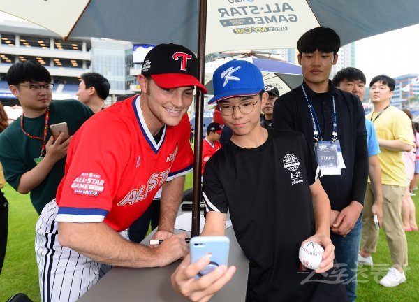 21일 창원NC파크에서 ‘2019 신한은행 MY CAR KBO리그’ 올스타전이 열렸다. LG 윌슨이 경기 전 열린 사인회에서 야구팬과 셀카를 찍고 있다.