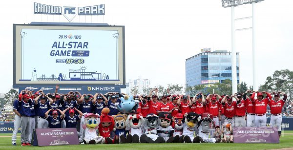 21일 창원NC파크에서 ‘2019 신한은행 MY CAR KBO리그’ 올스타전이 열렸다. 경기 전 올스타전에 출전한 10개구단 선수단과 마스코트들이 기념촬영을 하고 있다. 창원 | 김진환 기자 kwangshin00@donga.com