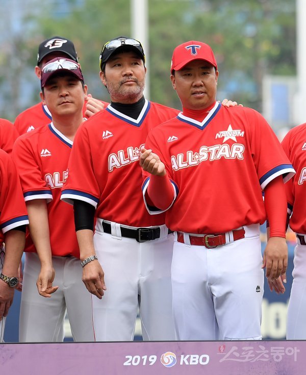 21일 창원NC파크에서 ‘2019 신한은행 MY CAR KBO리그’ 올스타전이 열렸다. 경기 전 이범가 기념촬영을 하고 있다. 창원 | 김진환 기자 kwangshin00@donga.com