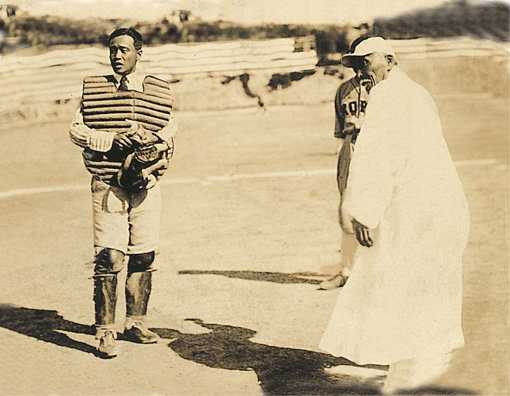 1920년 열린 전국체전의 전신, 전조선야구대회 당시 시구자로 나선 독립운동가 이상재 선생(오른쪽)의 모습. 허성무 창원시장은 21일 KBO 올스타전에서 이 도포 시구를 재연했다. 사진제공|대한체육회