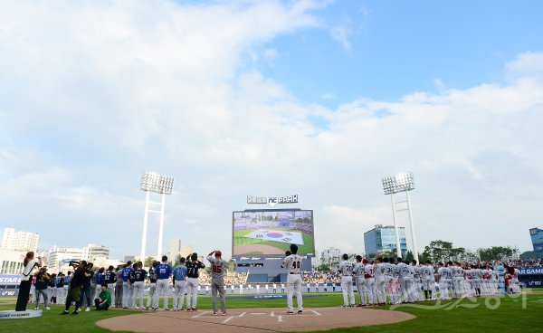 21일 창원NC파크에서 ‘2019 신한은행 MY CAR KBO리그’ 올스타전이 열렸다. 드림, 나눔 양 팀 선수단이 애국가를 제창하고 있다. 창원 | 김진환 기자 kwangshin00@donga.com