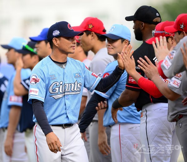21일 창원NC파크에서 ‘2019 신한은행 MY CAR KBO리그’ 올스타전이 열렸다. 롯데 공필성 감독대행이 입장을 하며 선수들과 하이파이브를 하고 있다. 창원 | 김진환 기자 kwangshin00@donga.com