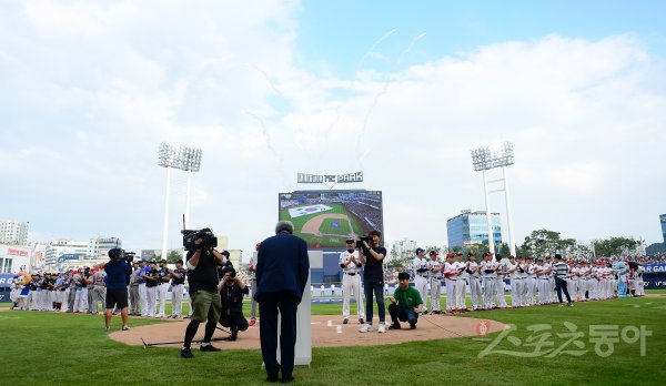 21일 창원NC파크에서 ‘2019 신한은행 MY CAR KBO리그’ 올스타전이 열렸다. 정운찬 KBO 총재가 개회사를 하고 있다. 창원 | 김진환 기자 kwangshin00@donga.com