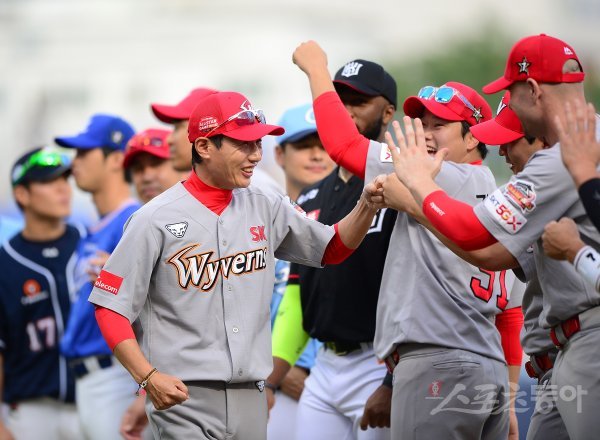 21일 창원NC파크에서 ‘2019 신한은행 MY CAR KBO리그’ 올스타전이 열렸다. SK 염경엽 감독이 입장을 하며 선수들과 하이파이브를 하고 있다. 창원 | 김진환 기자 kwangshin00@donga.com