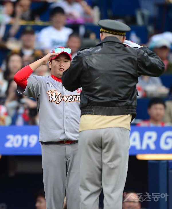 21일 창원NC파크에서 ‘2019 신한은행 MY CAR KBO리그’ 올스타전이 열렸다. 드림올스타 SK 김태훈이 맥아더 장군을 코스프레 한 로맥에게 경례를 하고 있다. 창원 | 김진환 기자 kwangshin00@donga.com