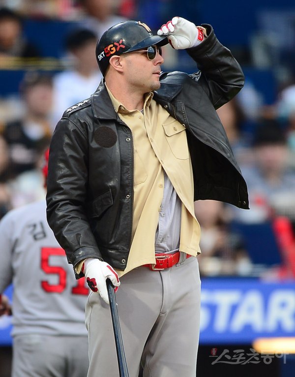 21일 창원NC파크에서 ‘2019 신한은행 MY CAR KBO리그’ 올스타전이 열렸다. ‘로-맥아더 장군’이란 별명을 가진 드림올스타 SK 로맥이 맥아더 장군을 코스프레 하기 위해 점퍼, 제복, 장군 모자, 선글라스, 담배 파이프를 착용하고 타석에 서 눈길을 끌고 있다. 창원 | 김진환 기자 kwangshin00@donga.com