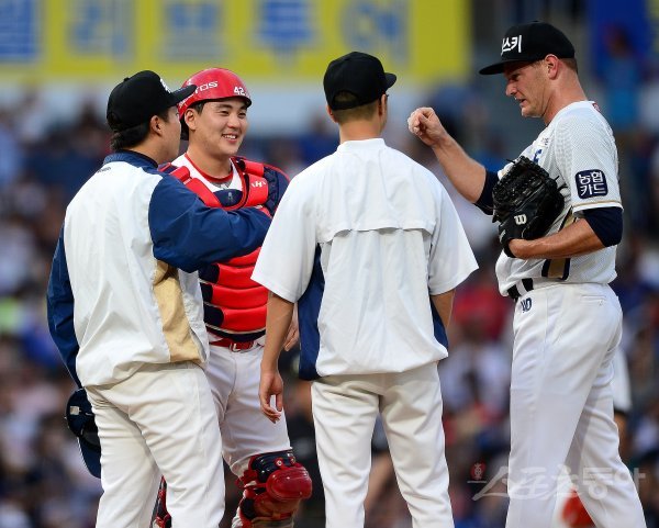 21일 창원NC파크에서 ‘2019 신한은행 MY CAR KBO리그’ 올스타전이 열렸다. 나눔올스타 KIA 한승택이 NC 루친스키가 한글이름이 적힌 모자를 쓰자 환하게 웃고 있다. 창원 | 김진환 기자 kwangshin00@donga.com