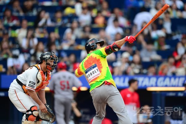 21일 창원NC파크에서 ‘2019 신한은행 MY CAR KBO리그’ 올스타전이 열렸다. ‘고볼트(고종욱+우사인 볼트)’란 별명을 가진 드림올스타 SK 고종욱이 우사인 볼트를 상징하는 자메이카 티셔츠에 앞, 뒤로 고볼트 마킹을 새긴 유니폼을 착용하고 타석에 서 눈길을 끌고 있다. 창원 | 김진환 기자 kwangshin00@donga.com