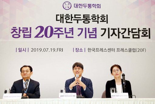 대한두통학회 주민경 부회장, 김병건 회장, 조수진 부회장(왼쪽부터)이 19일 서울 중구 프레스센터에서 열린 창립 20주년 기념 기자간담회에서 편두통 예방 치료 진료지침을 소개하고 있다. 사진제공|대한두통학회