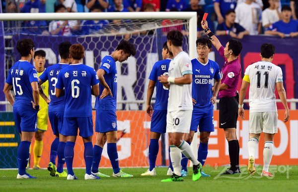 21일 경기도 수원월드컵경기장에서 열린 ‘하나원큐 K리그1 2019’ 수원 삼성과 성남 FC의 경기에서 수원 민상기가 주심으로부터 레드카드를 받고 있다. 수원 | 김민성 기자 marineboy@donga.com