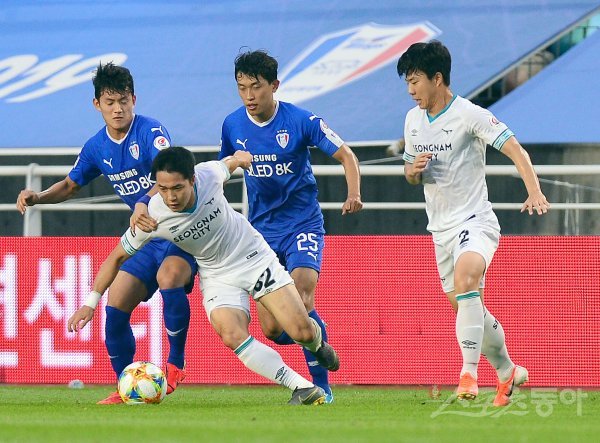21일 경기도 수원월드컵경기장에서 열린 ‘하나원큐 K리그1 2019’ 수원 삼성과 성남 FC의 경기에서 성남 이재원이 수원 수비수를 제치며 돌파하고 있다. 수원 | 김민성 기자 marineboy@donga.com