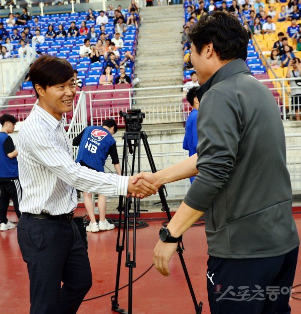 21일 경기도 수원월드컵경기장에서 열린 ‘하나원큐 K리그1 2019’ 수원 삼성과 성남 FC의 경기에서 성남 남기일 감독과 수원 이임생 감독이 악수를 나누고 있다. 수원 | 김민성 기자 marineboy@donga.com