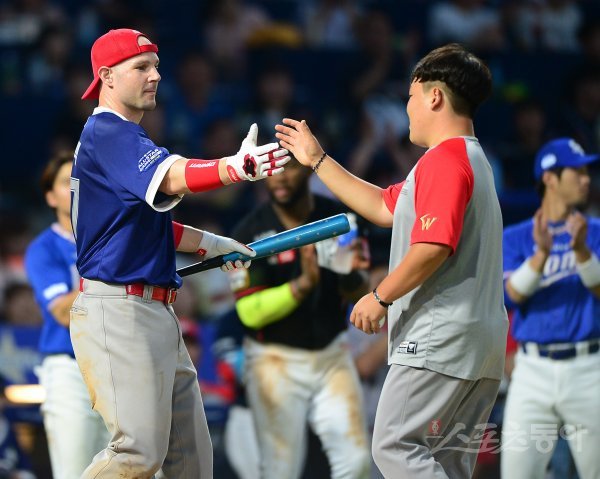 21일 창원NC파크에서 ‘2019 신한은행 MY CAR KBO리그’ 올스타전이 열렸다. 드림올스타 SK 로맥이 5회말이 끝난 후 열린 홈런 레이스 결승에서 7개를 친 후 공을 던져 준 팀 직원과 하이파이브를 하고 있다. 창원 | 김진환 기자 kwangshin00@donga.com