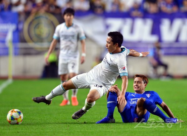 21일 경기도 수원월드컵경기장에서 열린 ‘하나원큐 K리그1 2019’ 수원 삼성과 성남 FC의 경기에서 성남 이재원이 수원 송진규의 태클에 넘어지고 있다. 수원 | 김민성 기자 marineboy@donga.com